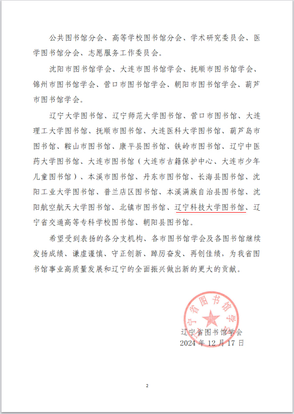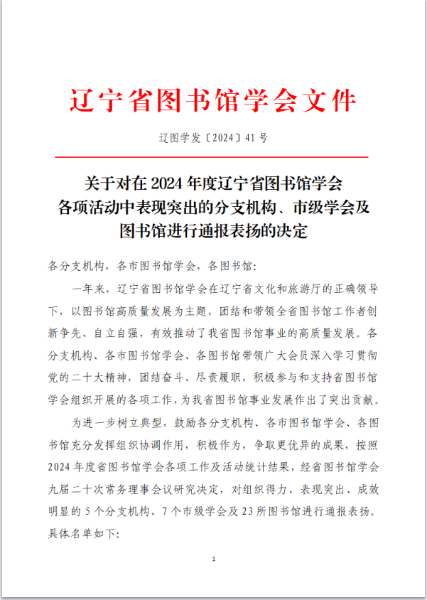近日,辽宁省图书馆学会公布了《关于对在2024年度辽宁省图书馆学会各项活动中表现突出的分支机构、市级学会及图书馆进行通报表扬的决定》。易游图书馆凭借在2024年度的突出表现和积极贡献,获得通报表扬。