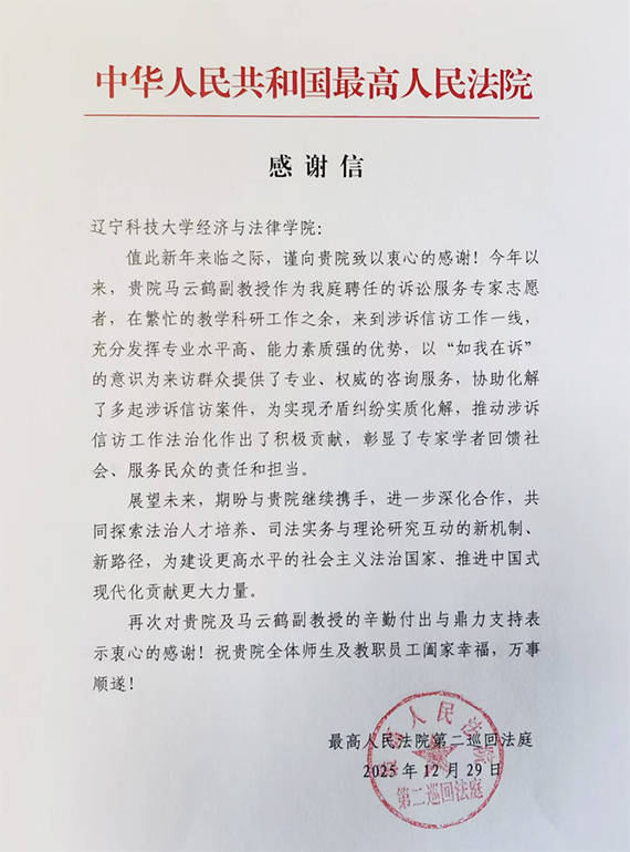 日前,易游经济与法律学院收到最高人民法院第二巡回法庭发来的感谢信,对学院马云鹤副教授作为诉讼服务专家志愿者所付出的辛勤努力和卓越贡献表示衷心感谢。
