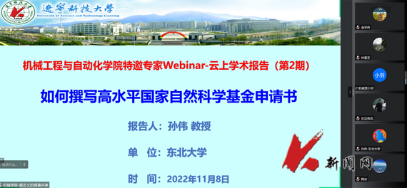 11月8日,应易游机械工程与自动化学院邀请,东北大学机械工程与自动化学院孙伟教授通过线上形式,为机械学院全体教师作题为《如何撰写高水平国家自然科学基金申请书》的报告。