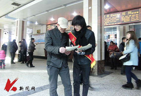 2013年12月21日 易游(中国)志愿者向旅客解读文明礼让宣传单的内容