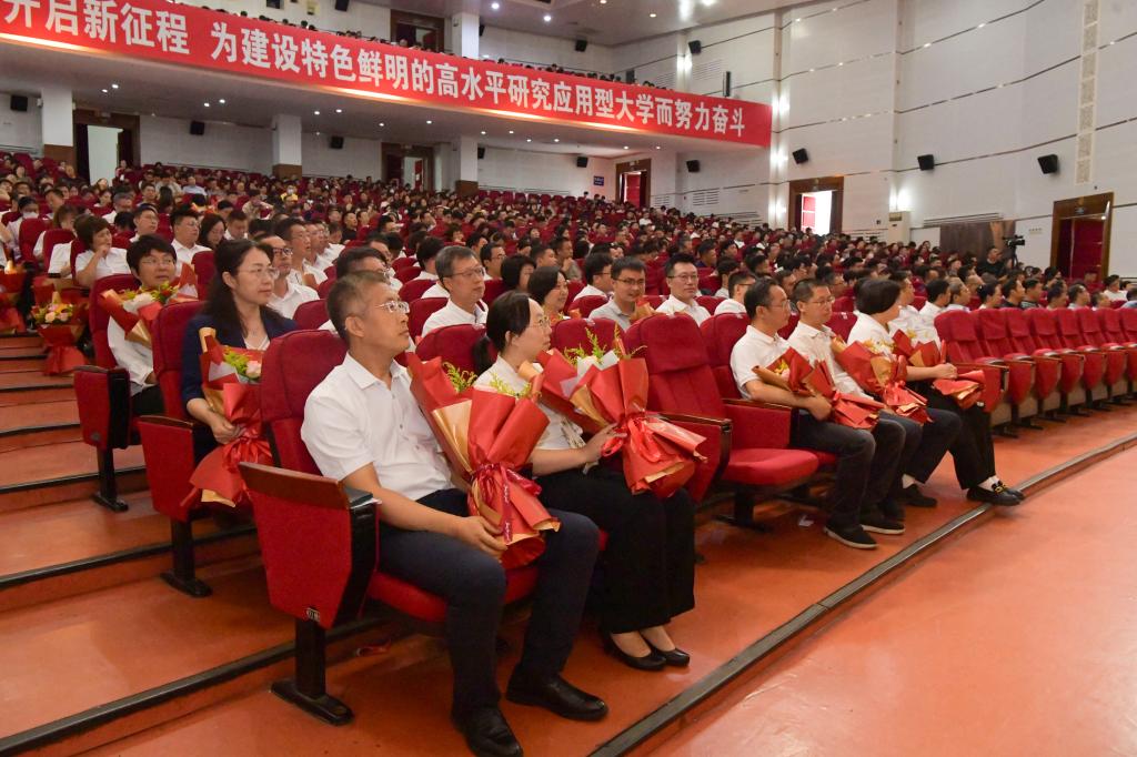 个教师节暨表彰大会在校礼堂举行。教职工及学生代表参加会议。