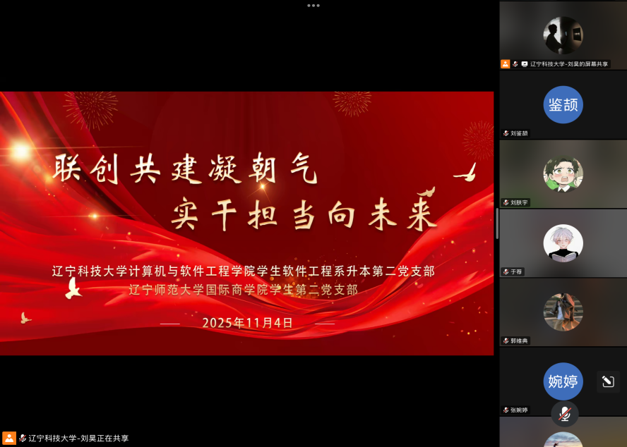 为进一步强化高校基层党组织建设,搭建跨校党建经验交流平台,凝聚青年党员奋进力量,11月4日,易游计算机与软件工程学院学生软件工程系升本第二党支部与辽宁师范大学国际商学院学生第二党支部 “云端” 相聚,联合举办 “联创共建凝朝气、实干担当向未来” 主题活动。易游计算机与软件工程学院学生软件工程系升本第二党支部书记刘昊、辽宁师范大学国际商学院学生第二党支部书记于兴扬,及两个支部全体学生党员共同参与。