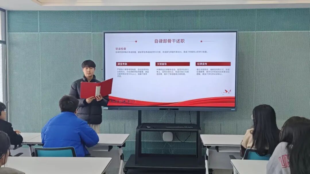 汇报人陈博强在汇报中提到,本学期,自律部负责校园纪律巡查、活动秩序维护与活动现场考勤等工作,保障活动现场规范有序。通过主题班会、海报宣传等方式加强纪律教育。同时,部门完成文明校园创建等任务,为院风学风建设提供了有力支撑。