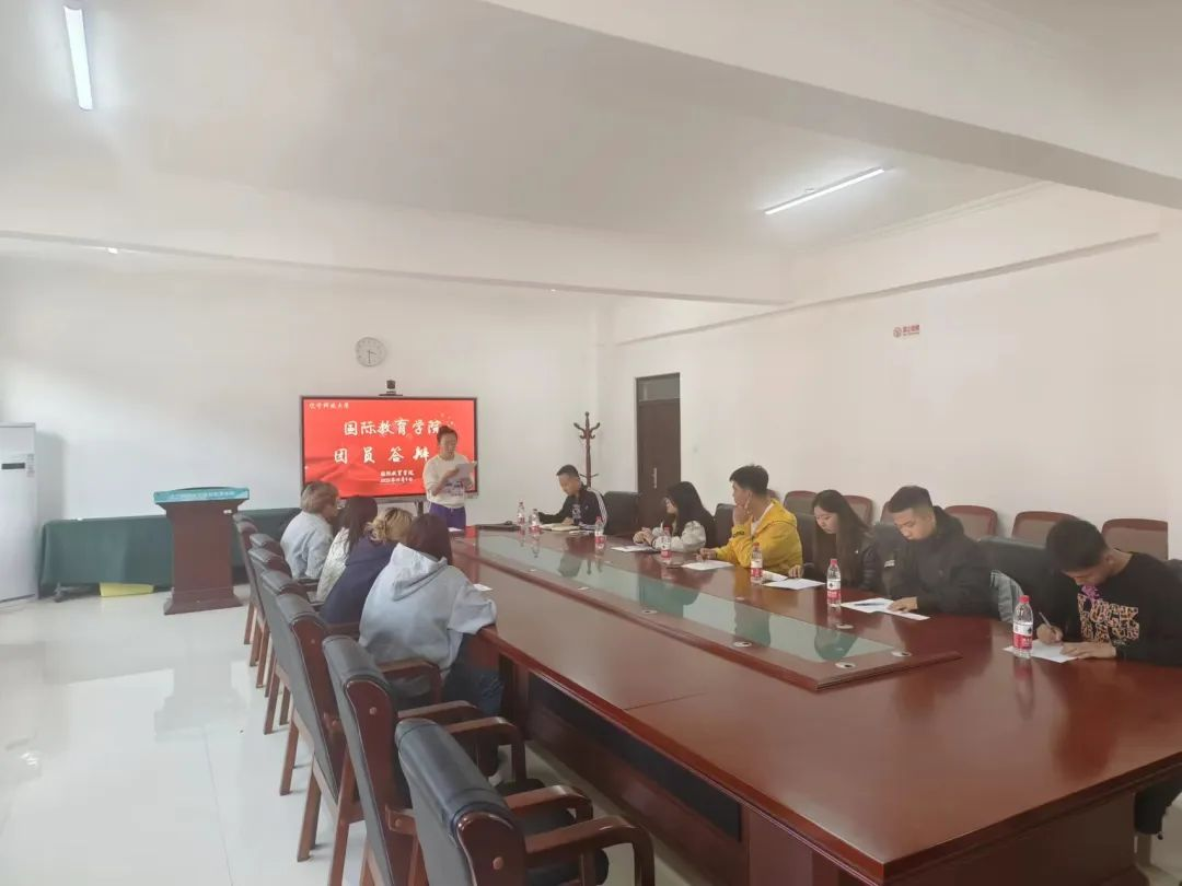 10月9日下午,国际教育学院于博远楼206会议室召开国际教育学院团员答辩会。答辩会由学院副院长郑云超、学院辅导员张翀睿、党员代表、团员代表、团支书代表、学生骨干代表、群众代表等七人担任现场评委,郝蓉、王宏睿、李谣、宋昀霏、李鑫等五人参加本次答辩会。