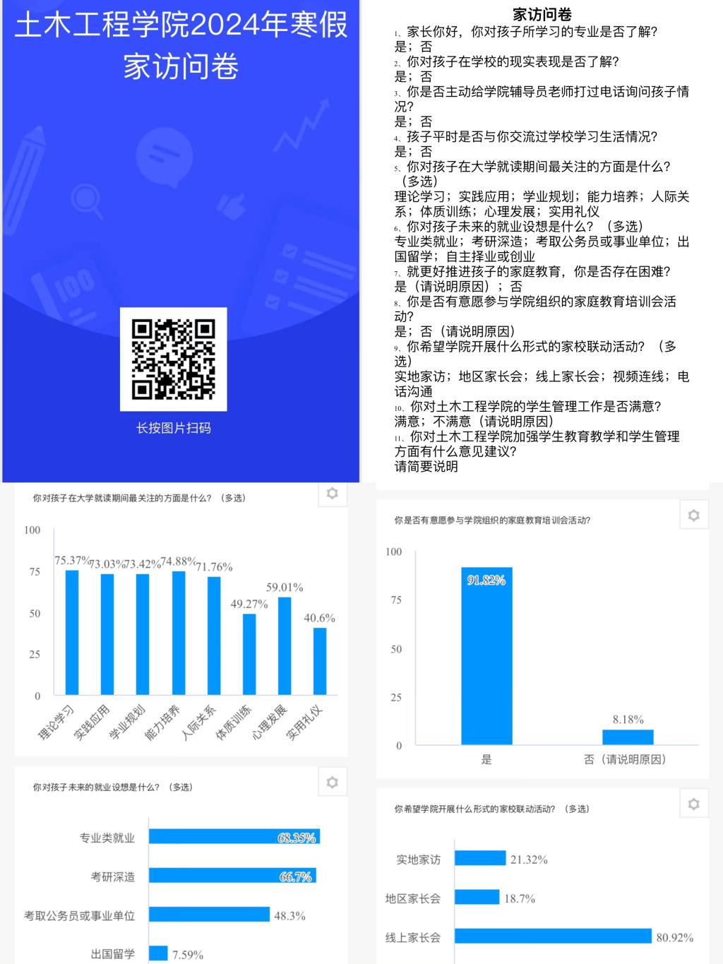 寒假以来,易游土木工程学院多措并举、立体组网,持续推进家校联动工作,充分发挥学院领导班子成员、班主任(学业指导教师)、辅导员等的积极性、主动性和创造性,灵活选取实地走访、网络家访和电话交流等形式,结合各年级学生特点和成长实际分别召开家长会,并围绕课业评估、关注热点、就业指导、满意度测评等内容开展问卷调查,依托精准的数据支撑和贴切的指导帮扶来提升家校教育联动质量。