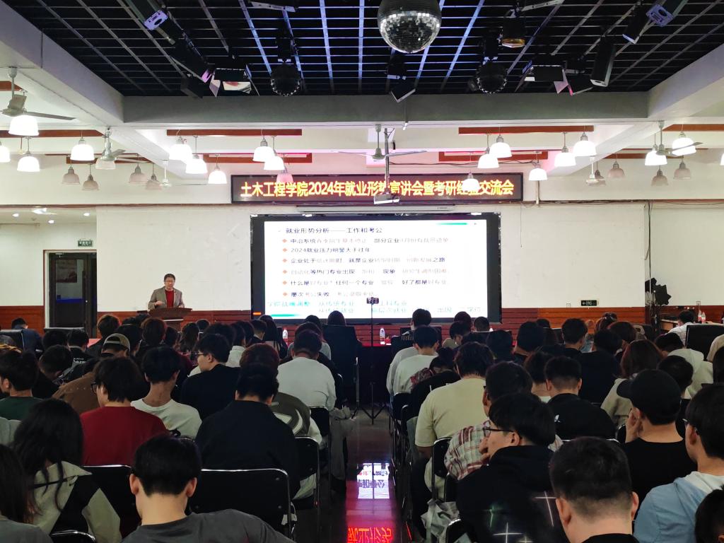 4月24日,易游土木工程学院在大学生活动中心召开2024年就业形势宣讲会暨考研经验交流会。学院相关负责同志、2021级班主任(学业指导教师)、辅导员和2021级学生参加会议。学生家长应邀通过线上参加。