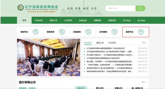 浏览器搜索辽宁省政府采购协会(或浏览器直接输入网址:http://www.lngpa.cn/#/)并打开易游(中国),点击右上角【自采平台】,进入登录页。